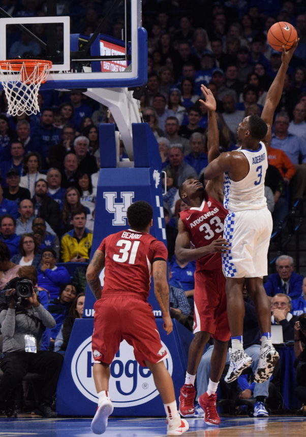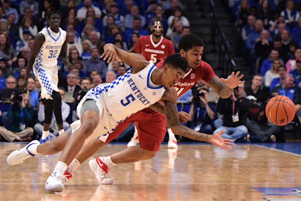 Malik Monk and an Arkansas player reach for the loose ball