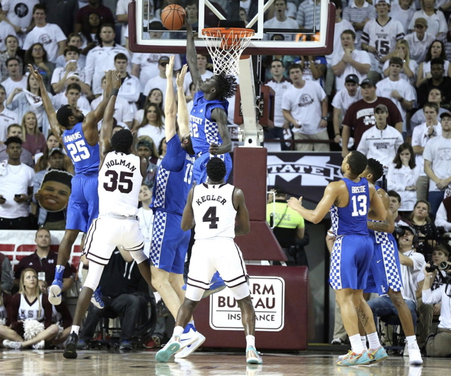 Wenyen Gabriel blocks the shot of Mississippi's State Aric Holman (#35) while Dominique Hawkins (#25) and Isaac Humphries also defends