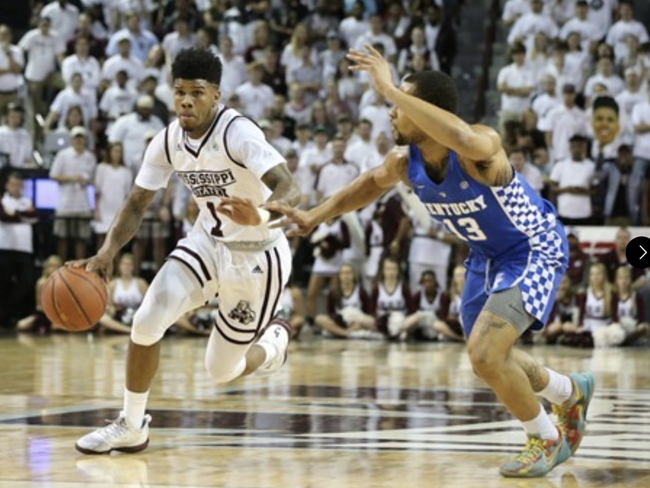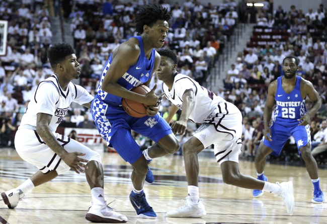 De'Aaron Fox tries to get between two Mississippi State defenders