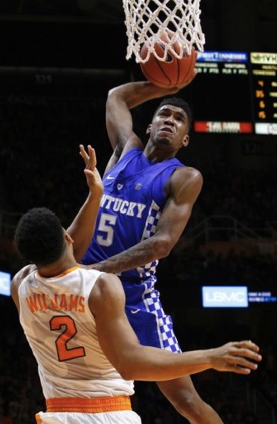 Malik Monk (#5) rises for, but ultimately misses a dunk attempt over Grant Williams (#2)