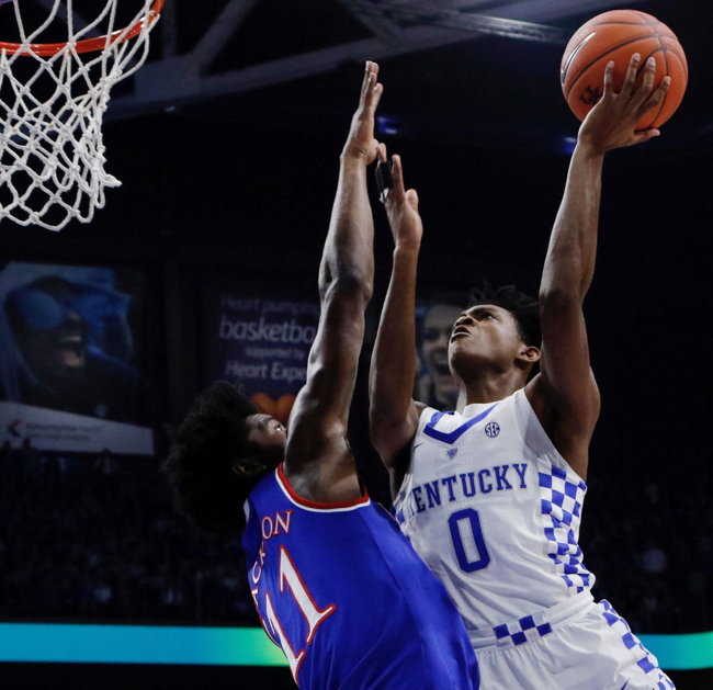 De'Aaron Fox (#0) challenges Josh Jackson (#11)