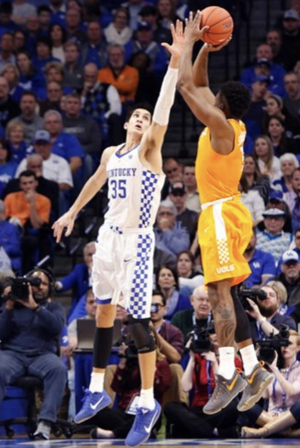 Derek Willis (#35) contests the shot of Tennessee's Admiral Schofield