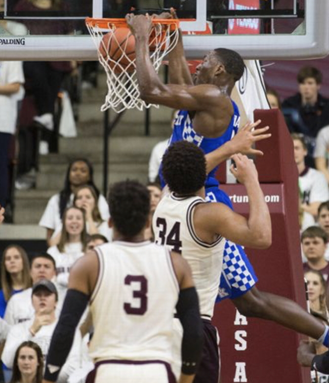 Edrice "Bam" Adebayo completes a dunk in front of Texas A&M center Tyler Davis (#34)