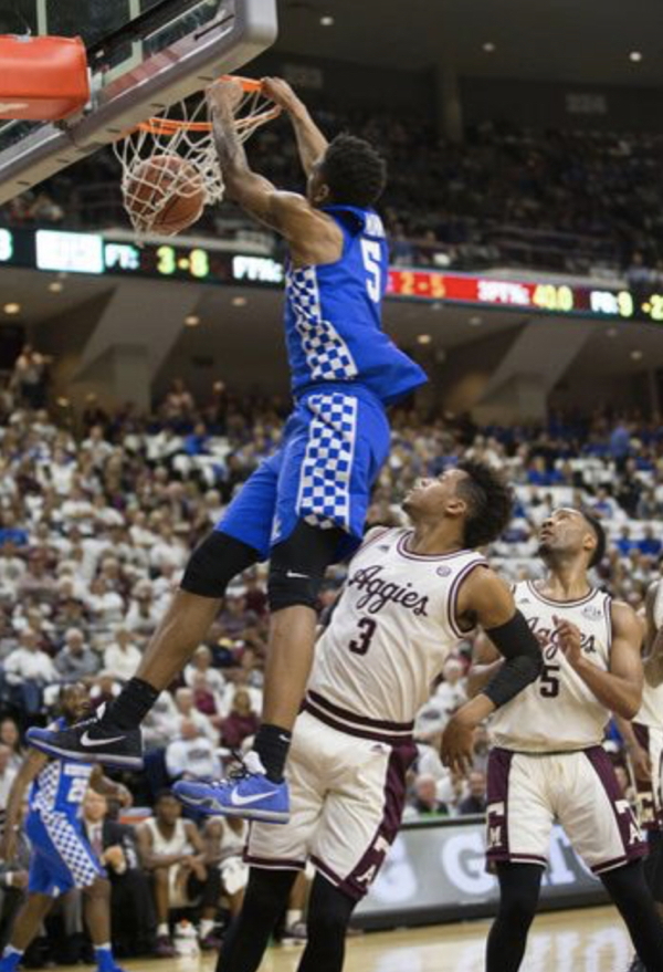 Malik Monk (#5) completes an alley oop over Texas A&M's Admon Gilder (#3)