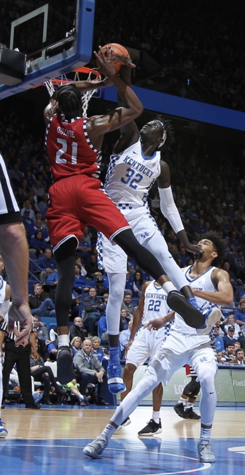 Wenyen Gabriel (#32) blocks the shot of UIC's Tai Odiase (#21)