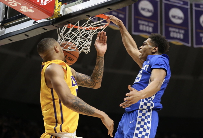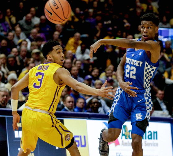 Shai Gilgeous Alexander (#22) zips a pass by LSU's Tremont Waters