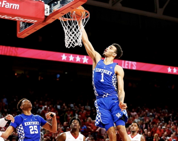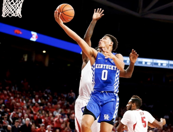 P.J. Washington (#25) fights inside to get a shot off between two Razorbacks while Jarred Vanderbilt (#2) prepares for a rebound
