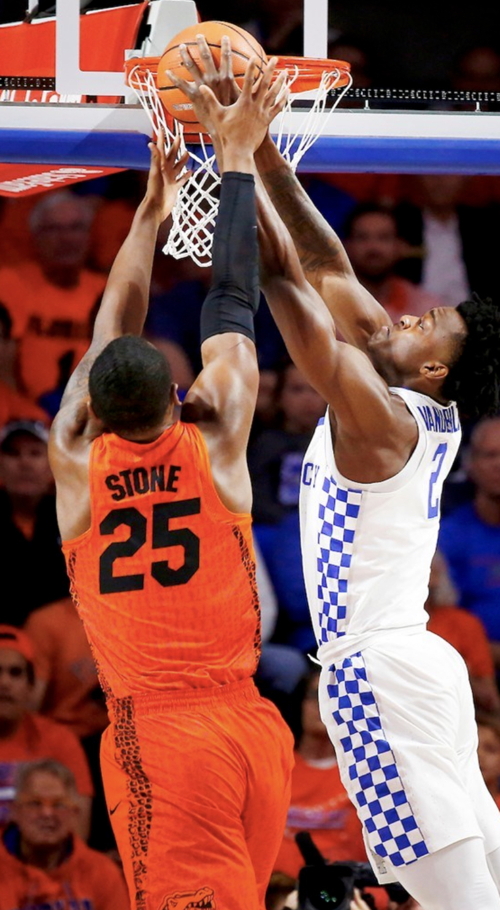 Jarred Vanderbilt reaches for a rebound with Florida's Keith Stone (#25)