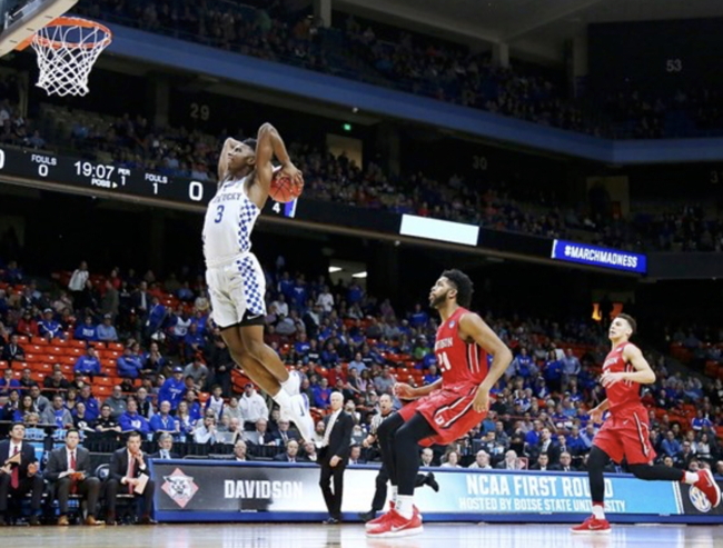 Shai Gilgeous-Alexander (#22) drives on Davidson's Jon Axel Gudmundsson