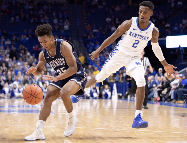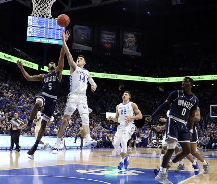 Tyler Herro (#14) drives to the basket while defended by Monmouth's Nick Rutherford (#5). Also shown are UK's Reid Travis (#22) and Monmouth's Ray Salnave (#0)