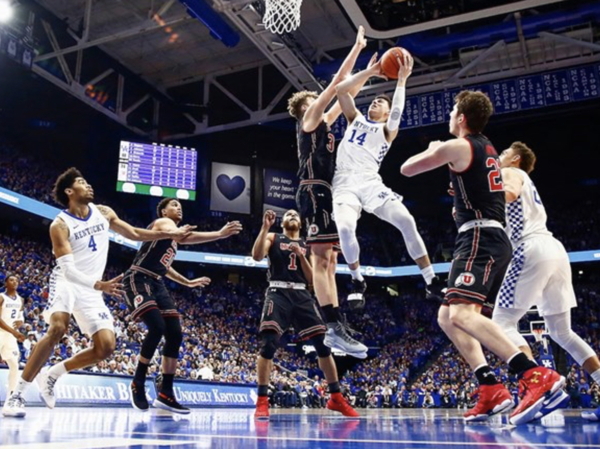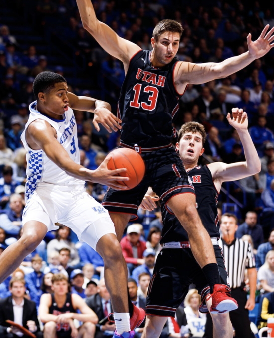 A Utah player tries to get a shot off between E.J. Montgomery (#23), Ashton Hagans (#2) and a third UK player