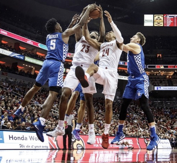 Immanuel Quickley (#5) and Reid Travis fight Louisville's Steven Enoch (#23) and Dwayne Sutton (#24) for a rebound