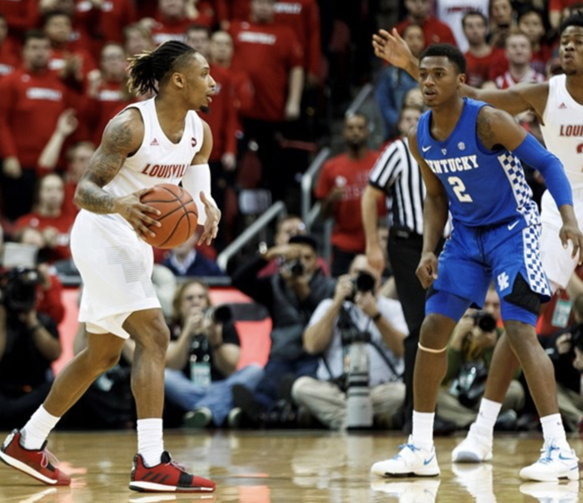 Ashton Hagans (#2) defends against Louisville's Khwan Fore