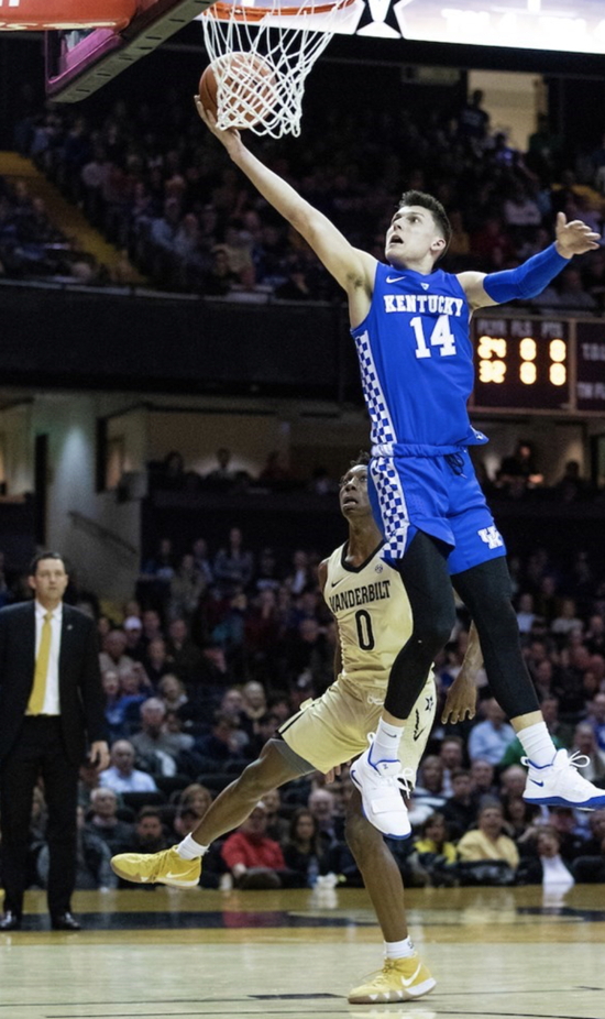 Tyler Herro (#14) scores a layup ahead of Vandy's Saben Lee (#0)