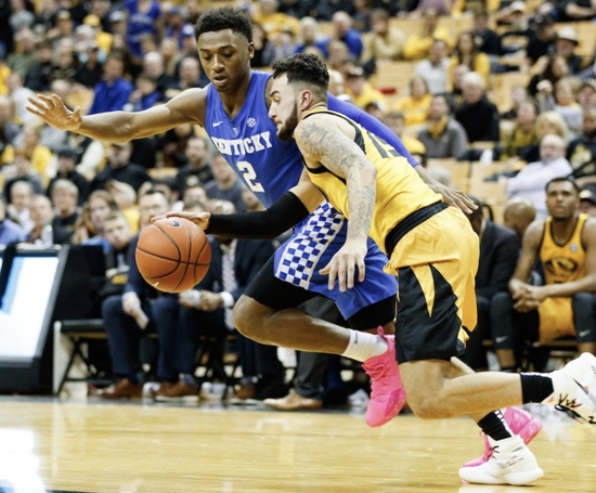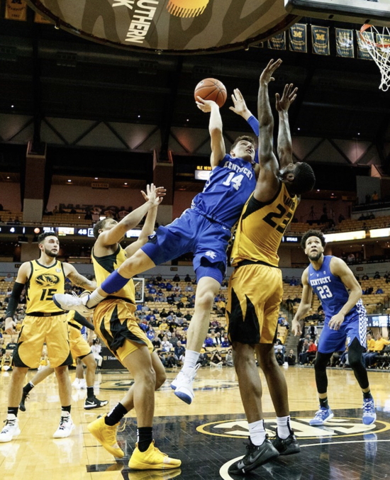 Tyler Herro (#14) shoots a difficult shot over Missouri's Jerimiah Tilmon (#23) while E.J. Montgomery (#23) prepares for the rebound