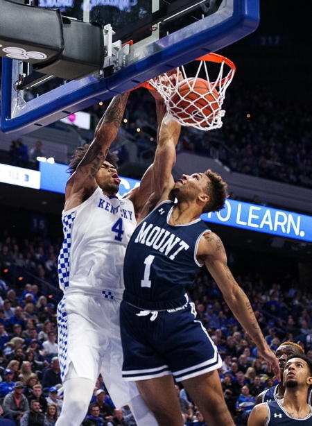 Nick Richards (#4) dunks over Mount St. Mary's Dee Barnes (#1)