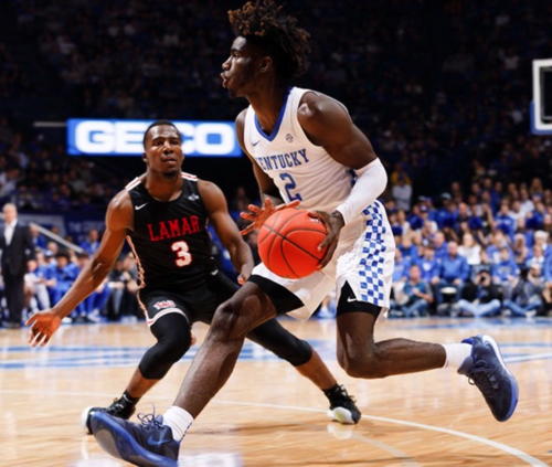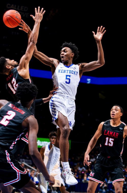 Immanuel Quickley (#5) dishes the ball while defended by Lamar's V.J. Holmes (#12)