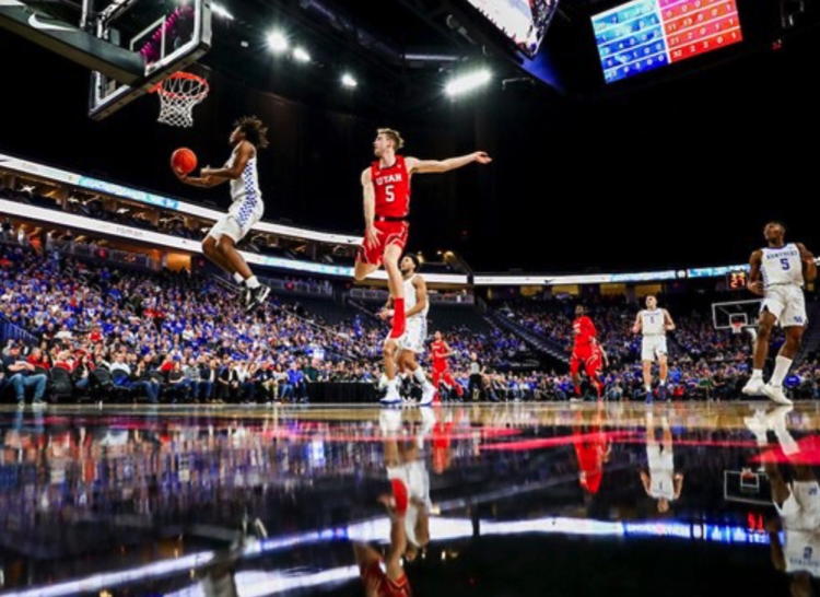 Ashton Hagans (#0) drives against Utah's Timmy Allen (#1) and Branden Carlson (#35) while Nick Richards (#4) looks on