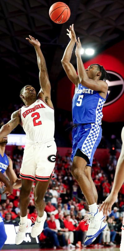 Immanuel Quickley (#5) shoots while defended by Georgia's Jordan Harris (#2)