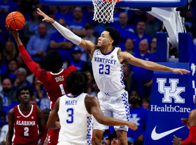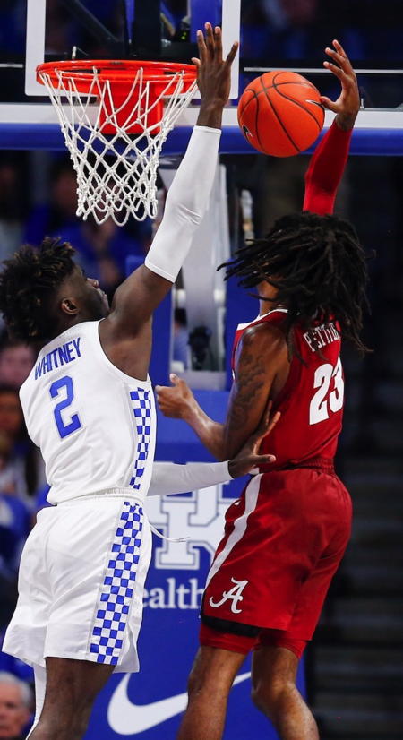 E.J. Montgomery (#23) extends to try to block a shot by Alabama's Herbert Jones (#1)