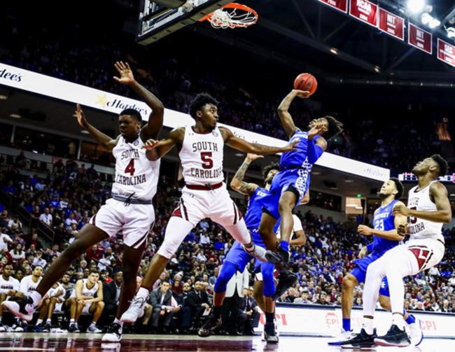 Keion Brooks Jr. (#12) looks to make a move past South Carolina's Jermaine Cousinard (#5)