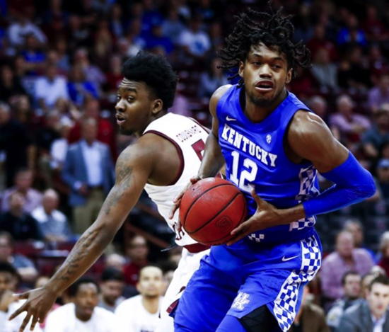 Ashton Hagans (#0) tries to score in behind South Carolina's Jermaine Cousinard (#5) and Jalyn McCreary (#4)