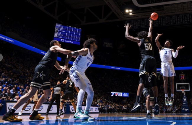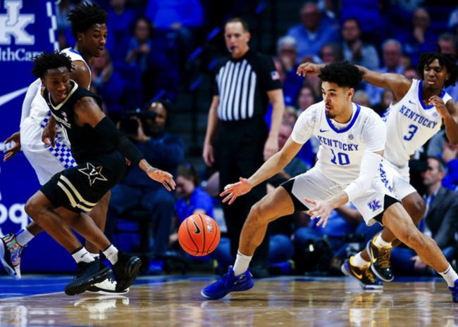 Johnny Juzang (#10) and Vanderbilt's Saben Lee reach for a loose ball