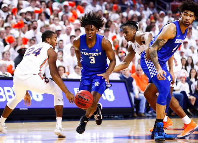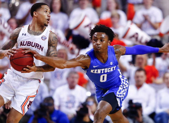 Ashton Hagans (#0) reaches in to try to poke the ball away from an Auburn player