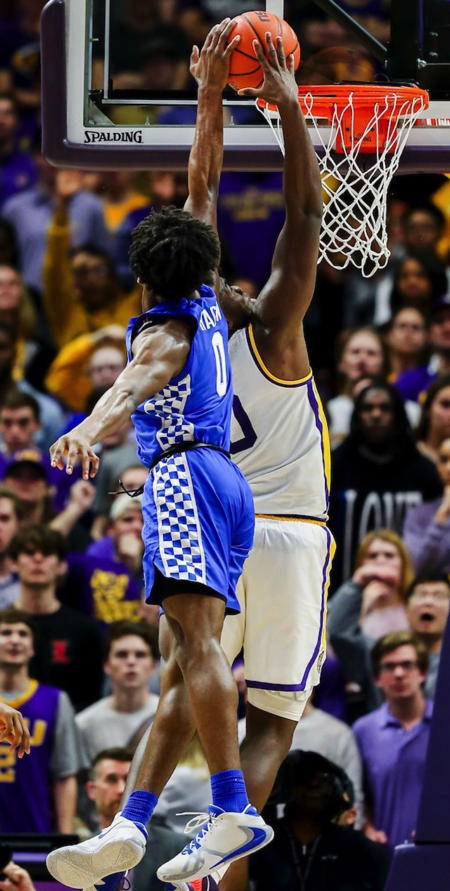 Ashton Hagans blocks a LSU shot from behind
