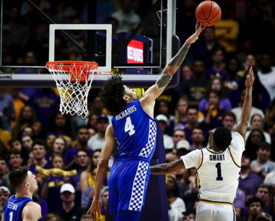 Nick Richards (#4) blocks the shot of LSU's Javonte Smart (#1)
