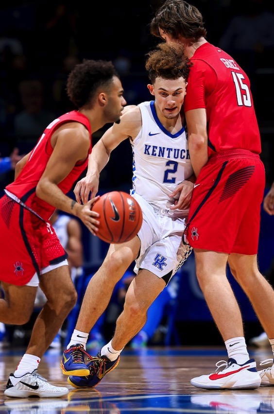 Olivier Sarr and B.J. Boston defend against Richmond's Nathan Cayo (#4)