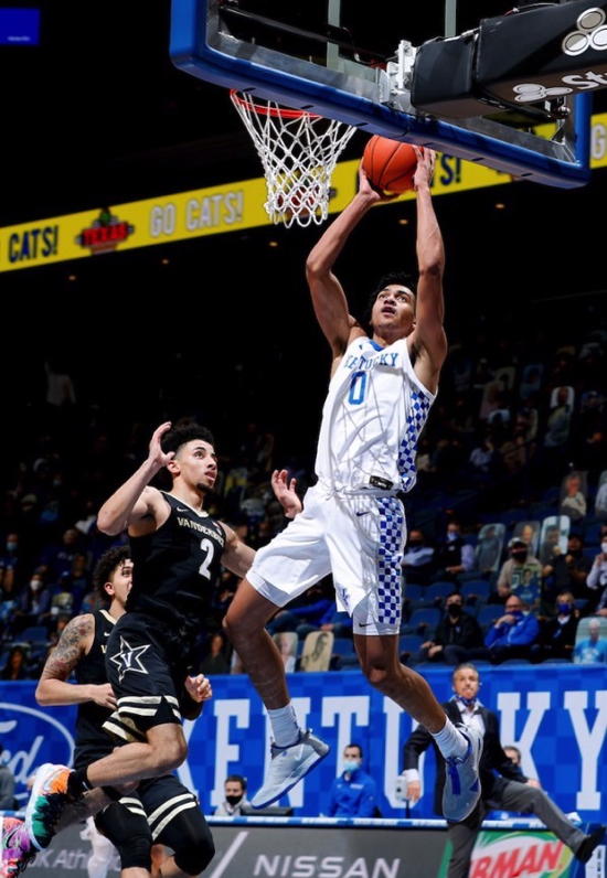 Jacob Toppin (#0) finishes a put-back in front of Vanderbilt's Scotty Pippen Jr. (#2)