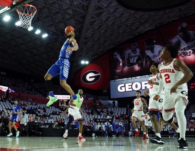 Devin Askew (#2) passes the ball while defended by Georgia's Andrew Garcia (#4)