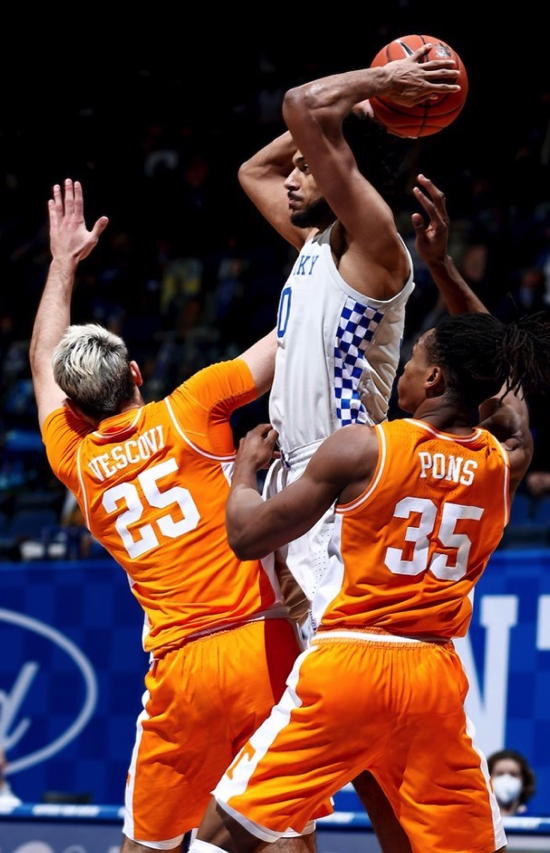 Olivier Sarr holds the ball over Tennessee's Santiago Vescovi (#25) and Yves Pons (#35)