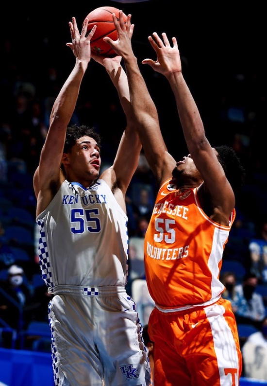 Lance Ware (#55) is defended by Tennessee's E.J. Anosike (#55)