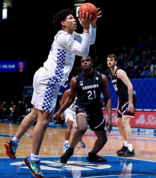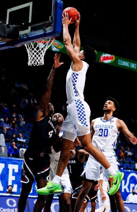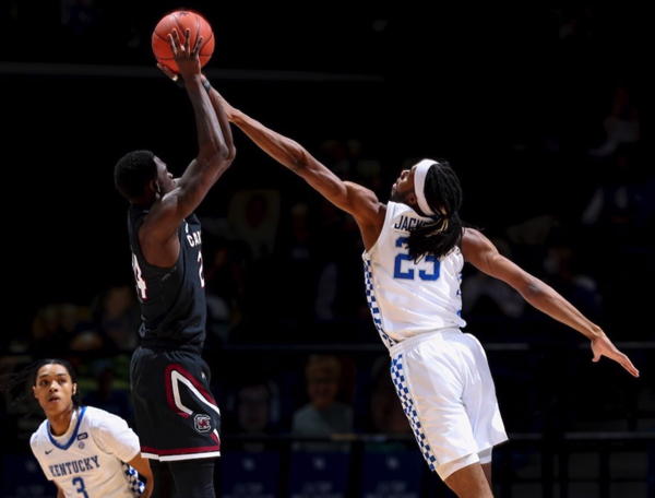 Isaiah Jackson (#23) blocks the shot of South Carolina's Keyshawn Bryant (#24)