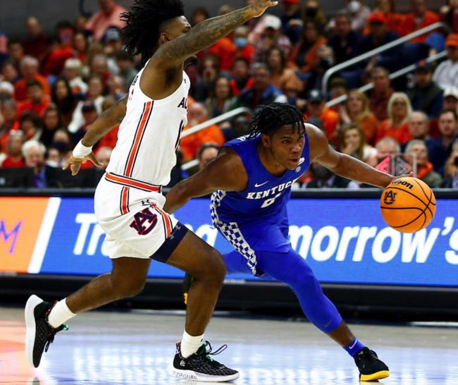 Oscar Tshiebwe (#34) tips off against Auburn center Walker Kessler (#13)