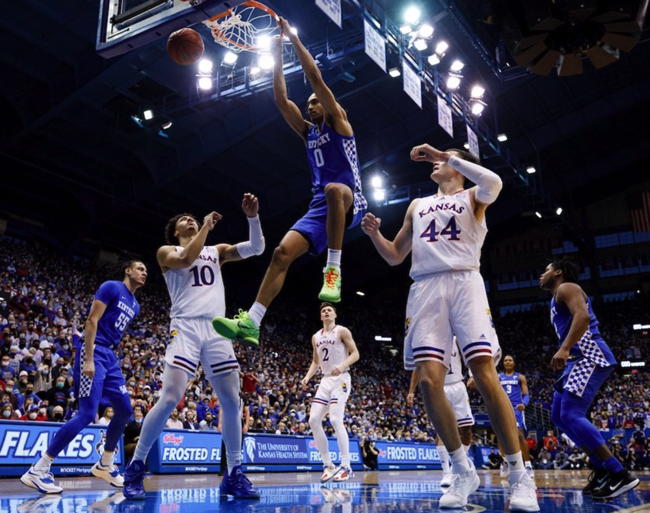 Jacob Toppin (#0) dunks as Kansas' Jalen Wilson (#10) can only look on