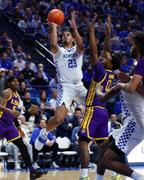 Bryce Hopkins (#23) shoots while defended by LSU's Brandon Murray (#0)