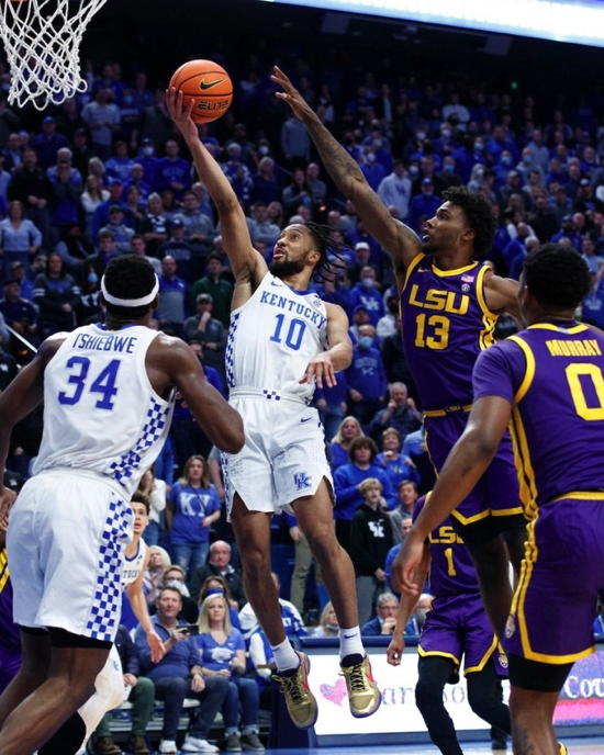 Oscar Tshiebwe (#34) is fouled on a shot attempt by LSU's Tari Eason (#13)