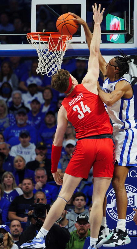 Ugonna Onyenso (#33) blocks the shot of Duquesne's Austin Rotroff (#34)