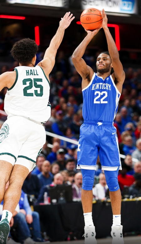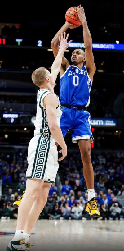 Cason Wallace (#22) shoots over MSU's Malik Hall (#25)