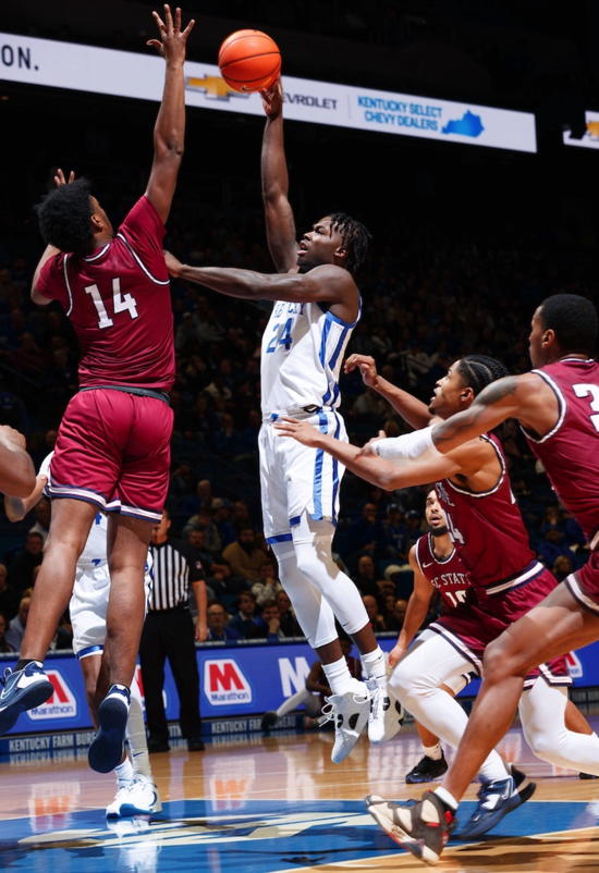 Chris Livingston (#24) shoots over SC State's Isaiah Turner (#14)
