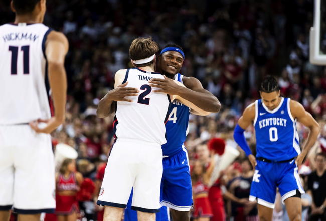 Oscar Tshiebwe hugs fellow All-American Drew Timme (#2) prior to tip-off while Gonzaga's Nolan Hickman (#11) and UK's Jacob Toppin (#0) wait