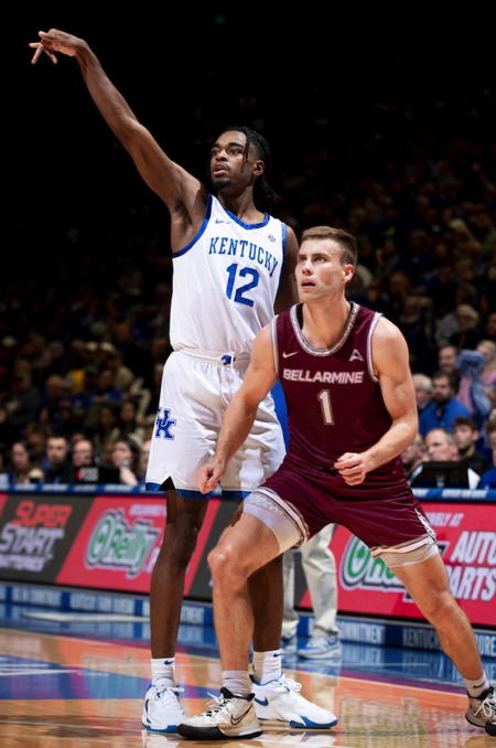 Antonio Reeves (#12) watches his shot along with Bellarmine's Justin Betz (#1)