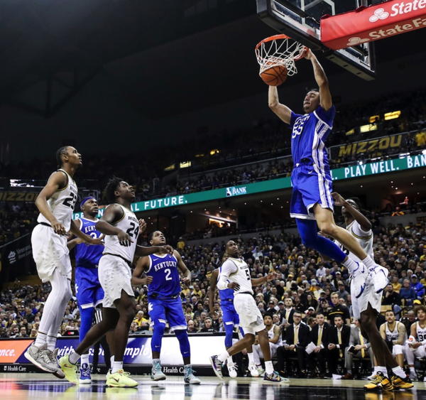 Adou Thiero (#3) and Oscar Tshiebwe try to track the ball down before Missouri's D'Moi Hodge (#5)