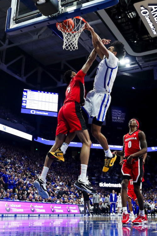 Cason Wallace (#22) shoots while defended by Georgia's Kario Oquendo (#3)