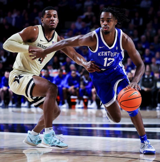 Antonio Reeves (#12) drives past Vanderbilt's (#4)