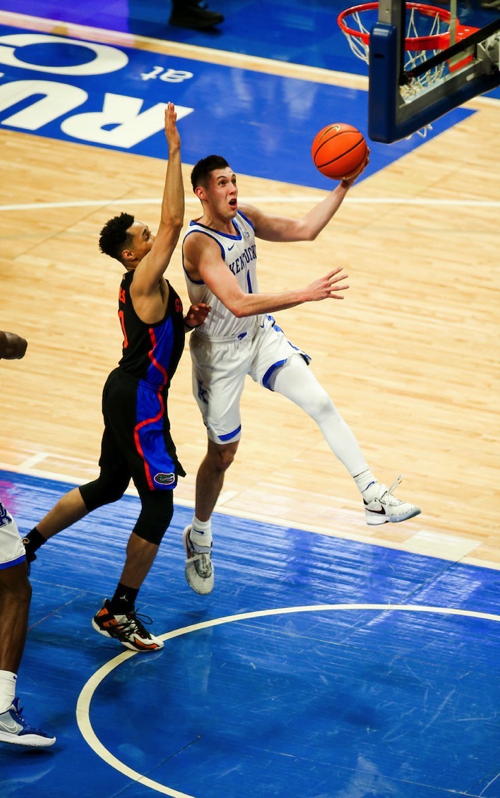 Oscar Tshiebwe dunks while Florida's Colin Castleton (#12) and Myreon Jones (#0) look on