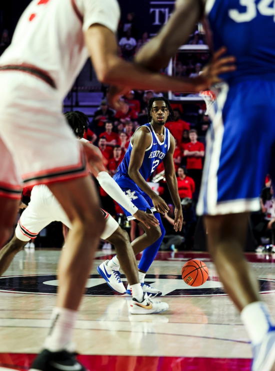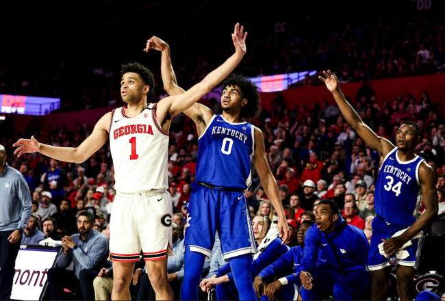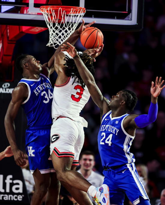 Oscar Tshiebwe (#34) and Chris Livingston (#24) defend a drive by Georgia's Kario Oquendo (#3)
